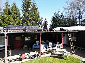 Dank der Erweiterung der bestehenden Klein-PV-Anlage durch zwei weitere Module im Bereich des Vereinsheims kann in Zukunft ein weiterer kleiner Anteil an Sonnenenergie in das vereinseigene Stromverteilnetz eingespeist werden. Die Module mit einigem Zubehör konnten sehr kostengünstig angeschafft werden und durch den Zukauf von etwas Zubehör ist die Ansicht in einem fast identischen Aussehen. Frank Jansen hat mit tatkräftiger Unterstützung von Jochen die Montage und den Anschluss nur in wenigen Tagen vorgenommen und seit Mitte April warteten die Module auf die Sonne, um Energie zu produzieren. Daumen hoch für die durchgeführte Arbeit. Erneut ein kleiner Baustein für unseren umweltbewussten Familiensportverein. DANKE.